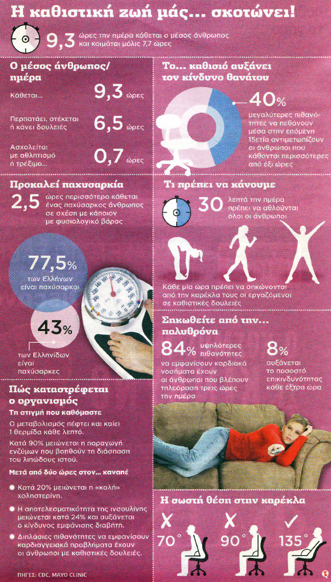 Μάλιστα, οι μελέτες δείχνουν ότι ο σύγχρονος άνθρωπος κάθεται κατά μέσο όρο 9,3 ώρες την ημέρα, περισσότερες δηλαδή απ΄όσες κοιμάται! «Ο οργανισμός αδρανεί και μπορεί να οδηγηθούμε σε καρδιαγγειακά προβλήματα ή να προκληθεί κάποιο εγκεφαλικό επεισόδιο», τονίζει ο γιατρός. Αξιοσημείωτο είναι ότι την ανθυγιεινή συνήθεια έχουν υιοθετήσει και τα παιδιά, ενώ για την παχυσαρκία ευθύνονται μεταξύ άλλων και οι ώρες που περνά κανείς καθισμένος.