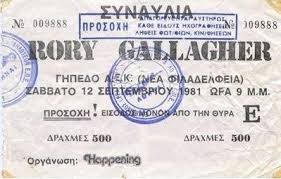 Το Σάββατο 12 Σεπτέμβρη του 1981, ο Gallagher ήρθε στην Ελλάδα και για μια συναυλία στο γήπεδο της Νέας Φιλαδέλφειας. Η συναυλία, μια απ’ τις πρώτες ξένων καλλιτεχνών που γίνονταν στη χώρα, είχε 40.000 θεατές και συνοδεύτηκε από σοβαρά επεισόδια με την αστυνομία. Σύμφωνα με την περιγραφή του ίδιου του καλλιτέχνη: «Ήμασταν βρεγμένοι, τα μάτια μας δάκρυζαν κι όλοι φοβηθήκαμε. Η συναυλία από μόνη της ήταν καταπληκτική. Αλλά ήταν επικίνδυνη. Απλά δεν ήθελα να πεθάνω σ’ ένα γήπεδο ποδοσφαίρου στην Ελλάδα, χωρίς να ξέρω καν τι συνέβαινε….». Την επόμενη μέρα οι εφημερίδες κυκλοφόρησαν με πρωτοσέλιδα όπως: «Κάηκε η Ν. Φιλαδέλφεια απ’ τους ροκάδες», «Συγκρούσεις με δυνάμεις των ματ, κάψιμο περιπολικών, ρίψη δακρυγόνων, κυνηγητό γύρω απ’ το σταθμό του ηλεκτρικού στον Περισσό». Η συναυλία αργότερα κυκλοφόρησε σε bootleg με τίτλο Live in Athens”.